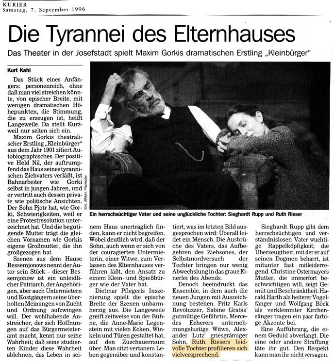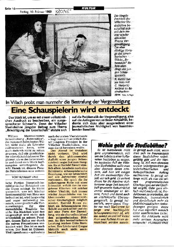 Mit Ruth Rieser hat er (Regisseur Werner Prinz) jedenfalls eine vielversprechende Titelfigur: Was auch immer die junge Kärntnerin bisher gespielt hat und das war so Verschiedenes wie etwa das vergeltungssuchende Vergewaltigungsopfer in Mastrosimones „Extremities“ oder die „Luise“ in Kusejs „Kabale und Liebe“-Version sie war hervorragend. Kronenzeitung