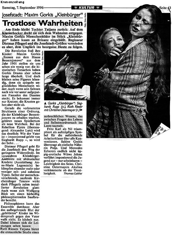 Ruth Rieser riskiert als Schauspielerin den Schritt aus sich selbst und damit eine Form der Darstellung, wie sie eher selten ist auf den zeitgenössischen Bühnen. Kronenzeitung